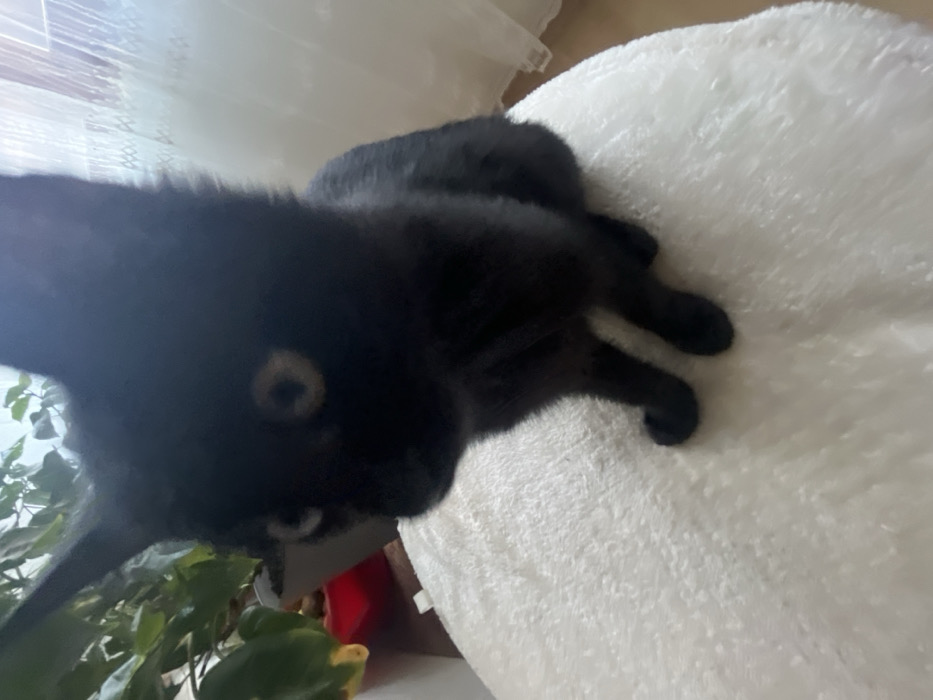 The scene is an interior setting, identified as being located in Mostar, Bosnia and Herzegovina. The primary subject is a small, black domestic cat with green-yellow eyes, seated upright on a white, fluffy textile surface. The cat's body is oriented towards the left of the frame, with its head slightly turned, suggesting it is looking off-camera. Its ears are erect. In the background to the left, a portion of a green potted plant with visible yellowed leaves is present, with a red container partially visible beneath it. To the right, a window covered by a translucent white sheer curtain provides diffuse natural light. No human subjects are visible.