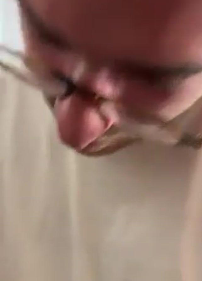 Here is a detailed description of the video. A man is using a hand blender to mix ingredients in a stainless steel bowl. He is wearing glasses and a light-colored t-shirt. The bowl contains a yellow and green mixture. The kitchen has white cabinets and tile walls. There is a red canister visible in the background. The man is focused on the task and is holding the blender steady as it mixes the ingredients.