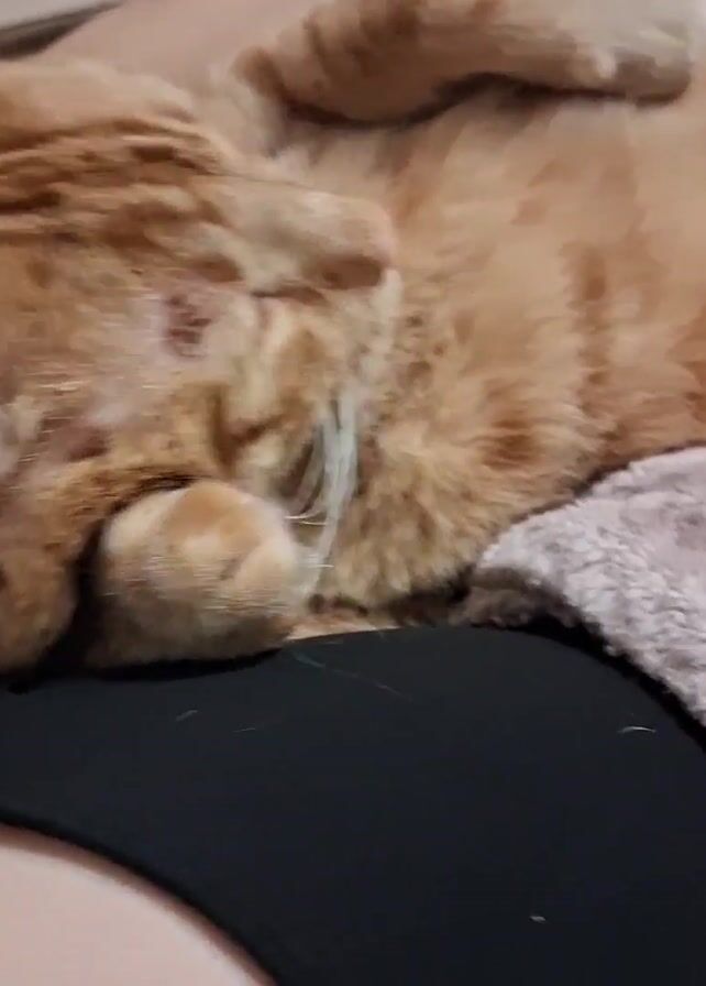 two sleeping animals. First, an orange tabby cat is resting on top of a person wearing a black shirt. The cat is curled up with its paws near its face. Next, the camera focuses on a dog tucked in a soft, tan-colored blanket. The dog is white with patches of black and brown and is curled up facing upwards.