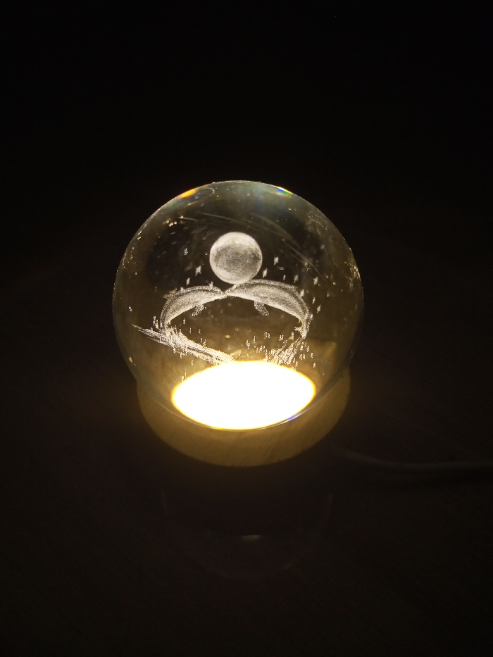 A clear crystal or glass orb, approximately spherical, rests on a dark, unidentifiable base. The orb contains an internal laser-etched design featuring a central smaller sphere positioned above two stylized, mirror-imaged figures resembling dolphins, which are arced upwards to almost meet the central sphere. Numerous smaller etched points are scattered throughout the orb, creating a starry or bubbly effect. The orb is illuminated from directly below by a strong, warm white light source, causing the etched designs to glow brightly against the otherwise dark background. A black electrical cable is visible extending from the right side of the base. The immediate environment is dark, with no discernible features beyond the object itself and its light source. No specific location in Ketowan, Indonesia, or any other city, is visible within the image.