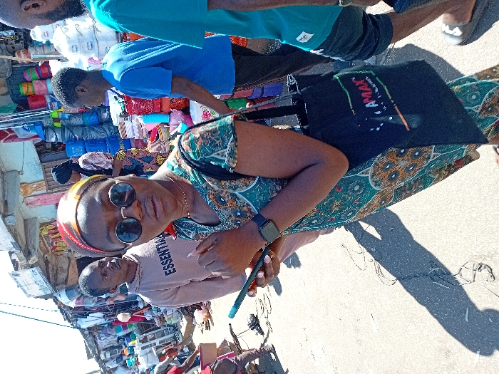 The image depicts an outdoor market scene in Jos, Nigeria, under bright daylight. A young woman, centrally positioned and facing the camera, wears round sunglasses, a multi-colored headscarf, and a green and brown patterned dress. She holds a red-cased smartphone in her right hand, wears a dark smartwatch on her left wrist, and carries a black tote bag with "AMAX" printed on it over her left shoulder. To her left, a young man in a light brown "ESSENTIALS" hoodie looks towards the left. To her right, a young man in a blue t-shirt stands facing away from the camera, towards the market stalls. The background features various market stalls, notably a section on the right displaying numerous stacked plastic household items such as buckets and basins in blue, red, pink, and white. Other stalls show clothing and assorted goods. The ground is a light-colored surface, possibly concrete or compacted earth, with visible shadows and loose electrical wiring.