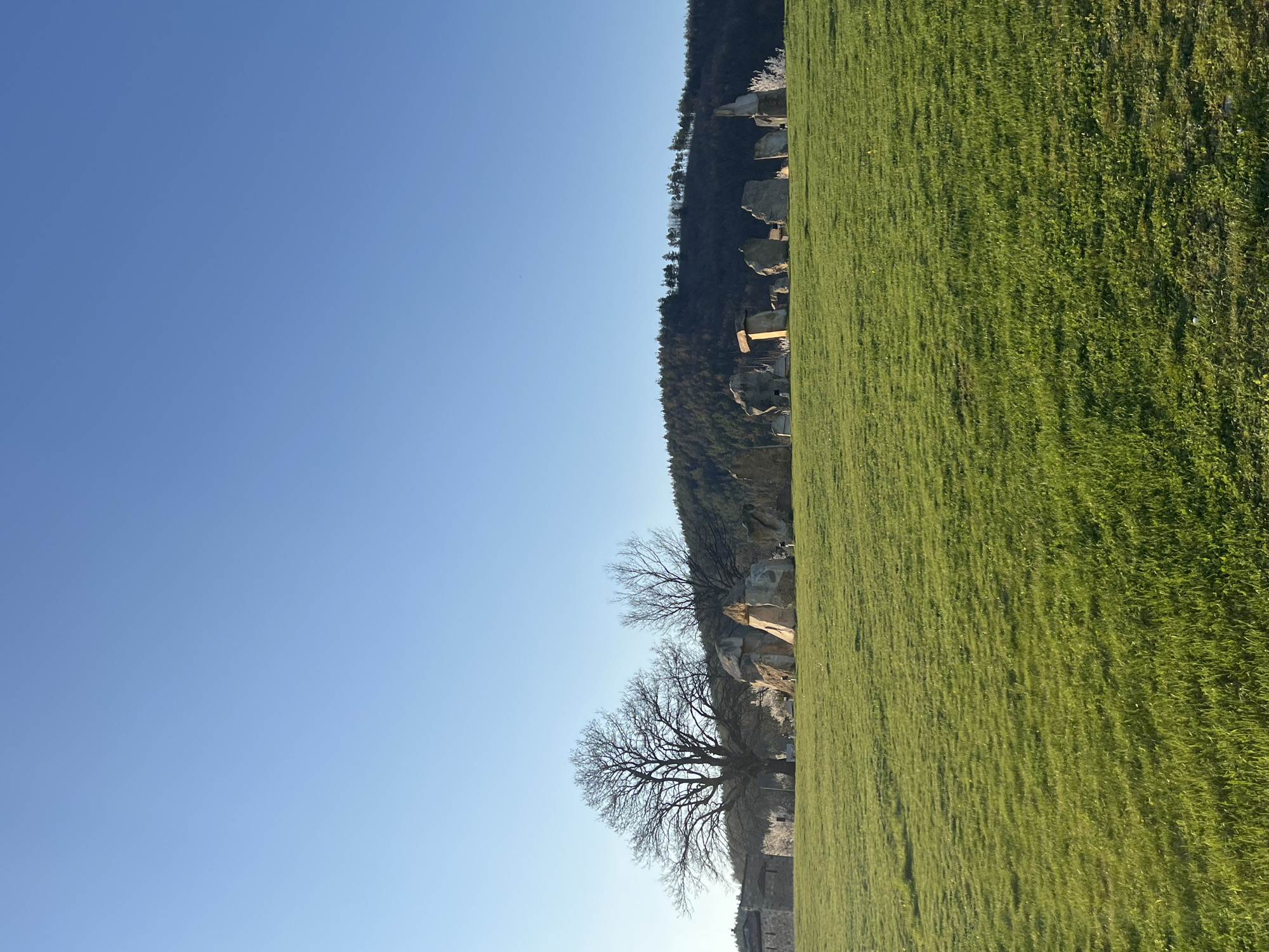 A landscape image shows a grassy field on the right and a clear blue sky on the left. A rocky hill runs diagonally between the field and the sky. Two leafless trees stand at the bottom of the hill. Above the trees, there are rocky outcrops and a strip of trees along the top of the hill. The location is Gardevtsi, Bulgaria.