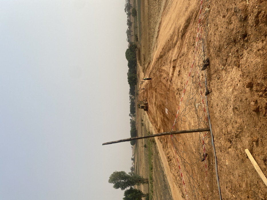 The image depicts an active road construction site in Wuciciri, Nigeria, under a hazy, light blue sky. A newly graded dirt road, reddish-brown in color, extends from the foreground into the far distance, flanked by flat, sparse fields and scattered trees. In the immediate foreground, a rough, dark wooden post stands upright in the center-left. Coiled barbed wire lies on the ground around the base of the post, partially secured by red and white striped caution tape. A black pipe or cable runs horizontally across the lower foreground, beneath the barbed wire. Midground details include a yellow construction vehicle, possibly a grader or bulldozer, positioned on the dirt road approximately midway down the visible stretch. Several individuals, at least four, are visible along the road beyond the vehicle, appearing to be workers; two in the mid-right wear high-visibility vests. The road surface shows tire tracks and disturbed earth. The background features agricultural or fallow fields on both sides of the road, with clumps of green trees lining the horizon, indicating a rural or semi-urban environment. The overall impression is one of ongoing infrastructure development in an open, dry landscape.