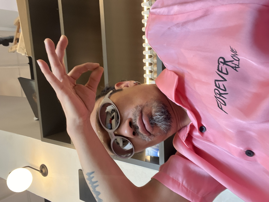 A male individual is depicted in an indoor setting in Herzliya, Israel. He wears a shiny pink short-sleeved collared shirt with black buttons and the text "FOREVER ALONE" in black on the left chest. He has a goatee beard and wears light-colored, oval-shaped reflective sunglasses and a small silver hoop earring in his left ear. A tattoo of jagged lines is visible on his left forearm. His right arm is raised, with his hand positioned above his forehead, fingers extended in a gesture (thumb, index, and middle fingers upward, ring and pinky fingers downward). He looks directly at the camera. The background shows a light-colored wall with a spherical wall lamp to the upper left. To the right, dark shelving units are visible, displaying items including a row of small, clear bottles with white caps on a lower shelf, and other indistinct objects such as a dark panel and wooden structures on higher shelves.