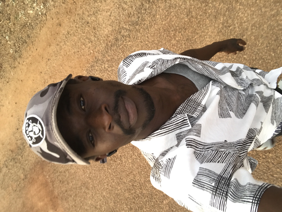 A man with a goatee and dark complexion wears a patterned gray cap with a logo and a white and black patterned shirt. He looks directly at the camera. He has on a gray shirt underneath his button-up. The ground is brown and grainy. One hand is visible and extended slightly away from his body.