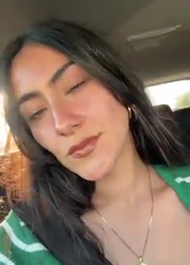 A woman is in a car, wearing a green and white striped shirt, a seatbelt, and gold jewelry. She has long, dark hair and is wearing lip gloss. The sun shines briefly into the car. The camera is held close to her face, suggesting she is recording herself.