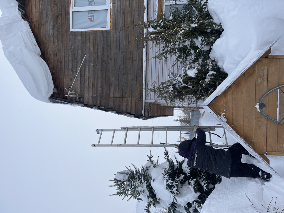 A residential area in Italmas, Russia, is depicted during winter under an overcast sky. A person, viewed from behind, wears a dark winter jacket with "Ростелеком" (Rostelecom) emblazoned on the back, dark pants, and light-colored gloves. They are positioned in deep snow, ascending a mound of snow towards a two-story house, while actively holding and maneuvering a silver-colored extension ladder. The ladder is leaning against the house, which features dark wooden plank siding on its upper section and lighter, possibly vinyl, siding on the lower story. A significant accumulation of snow extends from the upper roofline. An antenna is mounted on the wooden siding of the house. A white-framed window on the upper story is covered internally by a material displaying a red triangular logo. To the left, a tall, snow-laden evergreen tree stands prominently, while smaller, snow-covered coniferous shrubs are positioned along the house's lower wall. In the immediate foreground, a small, gabled wooden structure, partially covered in snow, is visible. The ground is uniformly covered in deep, undisturbed snow, indicating cold temperatures.