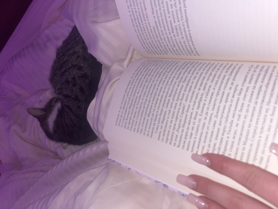The scene depicts an indoor environment on a bed in the city of Unknown, Unknown. A tabby cat with dark grey and lighter striped fur is curled in a sleeping position on white bedding, occupying the upper right portion of the frame. An open book, displaying white pages with black text in Cyrillic script, is laid upon the bed in the foreground. A human hand, featuring long, light pink artificial nails, is visible in the lower left, resting near the left page of the book. The entire environment is illuminated by a predominant purple light source.