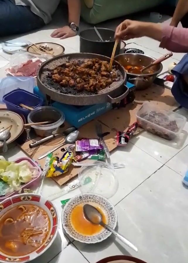 A low-angle shot captures a group of people sitting on a white-tiled floor, engaged in cooking and eating. A round grill, balanced on a blue portable stove, dominates the center of the frame with food cooking on it. A person stirs the food on the grill with wooden utensils. Around the grill are various dishes, including soup, sauce, and vegetables, along with used plates and utensils scattered on the floor. Plastic containers, snack wrappers, and other debris contribute to a cluttered environment. One person wears a gray long-sleeved shirt and a watch, sitting with their legs stretched out, while another person wears a pink long-sleeved shirt. A green cushion rests against a wall in the background. The scene depicts a casual, possibly indoor, gathering centered around food preparation and consumption.
