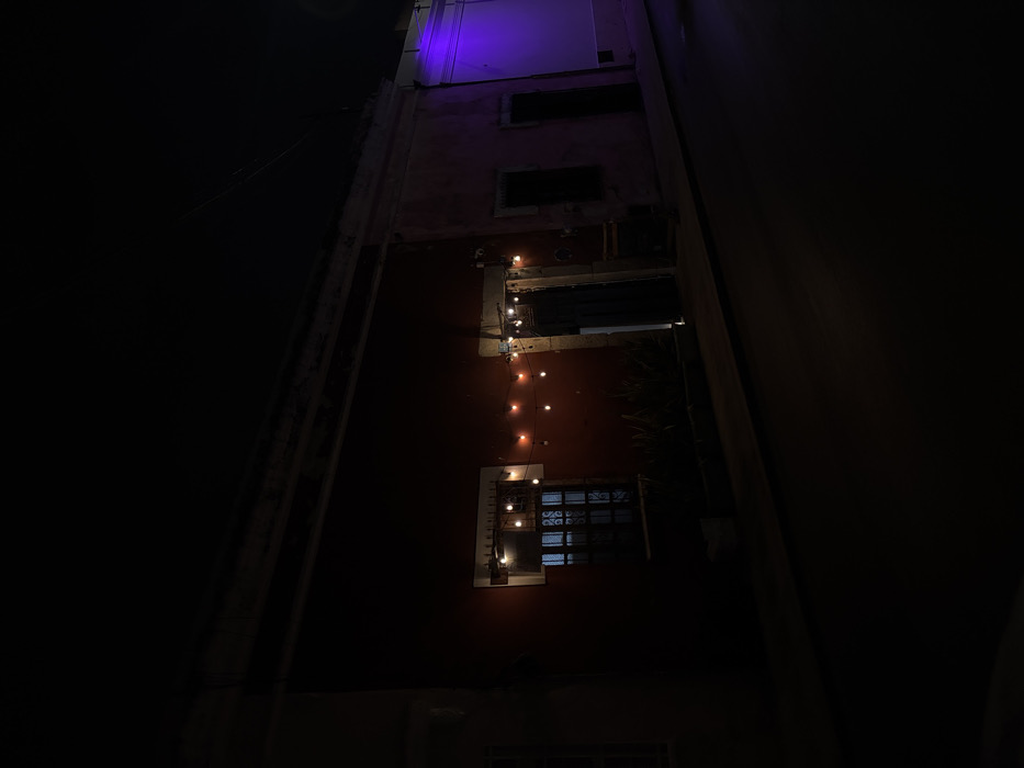 This nighttime image depicts a residential or commercial street in Mérida, Mexico, observed from a slight downward angle. The scene is dominated by the facades of two adjacent buildings under a dark sky. On the left, a building presents a dark red, possibly maroon, stucco facade. A rectangular window with dark, ornate grates is visible, from which a faint blue-white light emanates. Above and to the right of this window, a string of approximately ten warm, incandescent globe lights is strung horizontally, illuminating a small portion of the facade. To the right of the string lights, a dark, recessed doorway is partially open, revealing a faint warm light within. Below the string lights, a planter or small garden bed with dark foliage is present at the base of the wall. Adjacent to the dark red building on the right is a second structure with a lighter, faded pink or pale purple stucco facade. This building features two dark, rectangular openings, possibly windows or doorways, which are unlit. The far right section of this building is brightly illuminated by an intense purple light source, casting a strong violet hue across its surface. The street in the foreground is paved, dark, and appears to be asphalt, sloping gently upwards towards the right. A dark sidewalk or curb line separates the street from the building facades. No people, vehicles, or discernible activities are present in the image. The overall illumination is low, primarily from the string lights, the internal window and doorway lights, and the distinct purple exterior light.