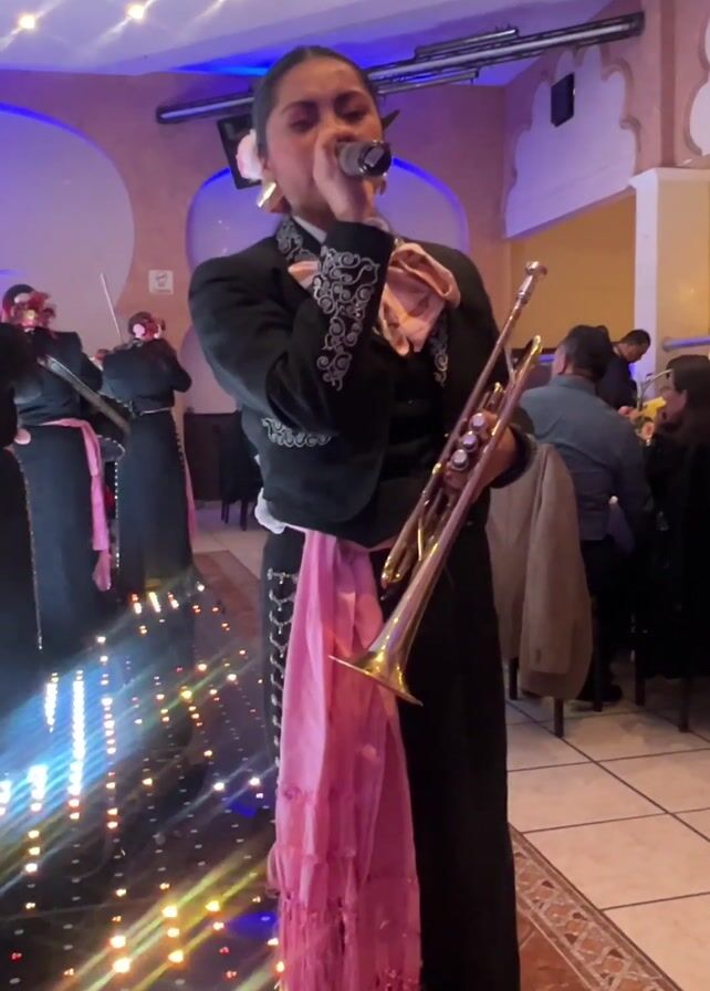 A female Mariachi singer is performing. She is wearing a black suit with silver embroidery, a pink scarf, and a flower in her hair. She is holding a microphone and a trumpet. The singer is standing on a light-up dance floor in a restaurant or venue. Behind her are other members of the Mariachi band playing instruments. People are seated at tables in the background. The room has a decorated ceiling and pillars. The camera is handheld and moves slightly.