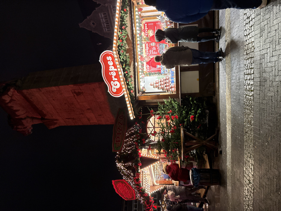 A nighttime scene depicts a festive Christmas market, featuring food stalls. One stall offers crêpes, with a prominent sign. Adjacent is a pizza stall, also adorned with lights and signage. People are gathered, likely purchasing food. The stalls are decorated with Christmas trees, ornaments, and lights, contributing to the holiday ambiance. A red stone building is visible in the background. The ground appears to be wet, possibly from recent rain.