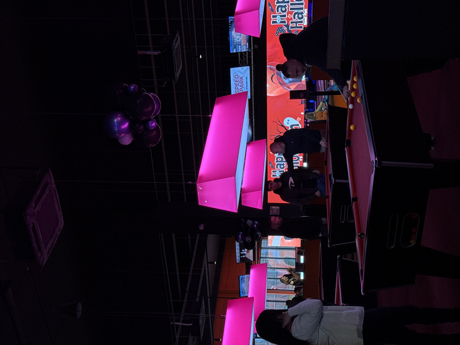 This image captures an indoor scene within an entertainment venue, identified as "Speed Park Strasbourg" in Reichstett, France, based on visible signage. The environment is dimly lit with bright neon-pink rectangular overhead lighting fixtures, a black ceiling, and dark flooring. Visible ceiling-mounted air conditioning units and clusters of metallic purple balloons are present. In the foreground, a woman with dark hair, wearing a light-colored top and dark pants, stands with her back partially to the viewer, her left hand near her face, observing the scene to her right. Multiple black-framed pool tables with red felt are arranged across the space. In the midground, to the right, a man with dark hair tied in a bun, dressed in a dark hoodie, leans over a pool table, poised to strike a white billiard ball with a cue stick towards a cluster of yellow balls. To his left, three other men are gathered around an adjacent pool table. One bald man, wearing a dark top, extends his right arm and points towards the right side of the frame, engaging with the other two men; one has a dark beard and wears a dark jacket, while the other wears a dark jacket. In the background, large digital screens display "Happy Halloween" with a ghost graphic, alongside the "SPEED PARK Strasbourg" logo. Further in the background, another woman is visible near a counter, smiling and holding a drink.