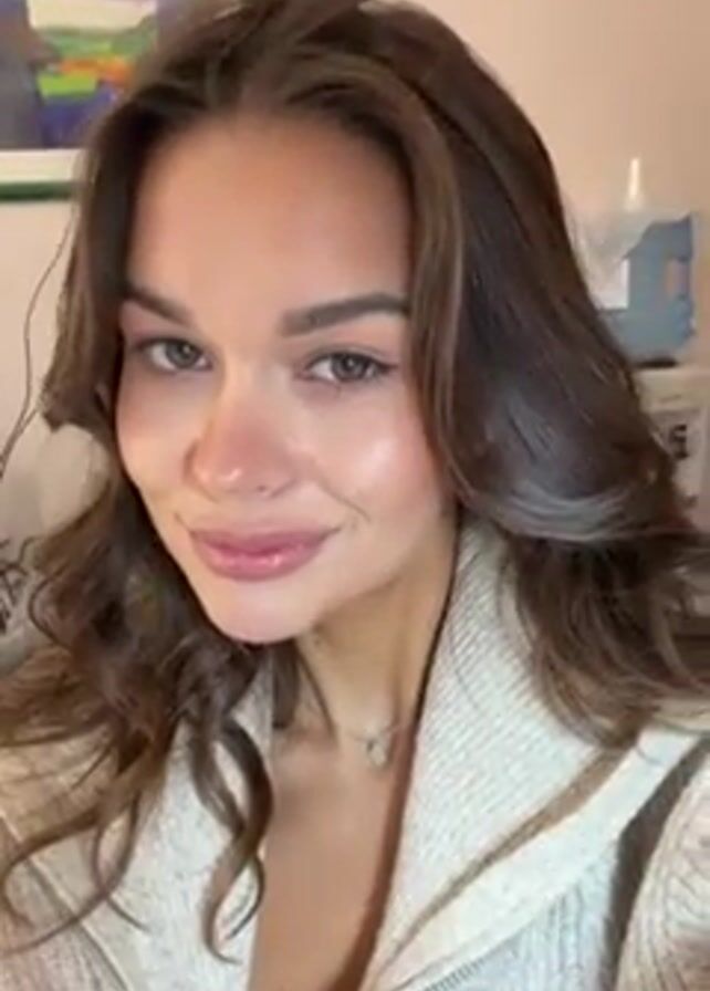 A woman with long, wavy brown hair smiles at the camera. She is wearing a cream-colored sweater and a small necklace. The background includes a framed painting and a few decorative items on a table.