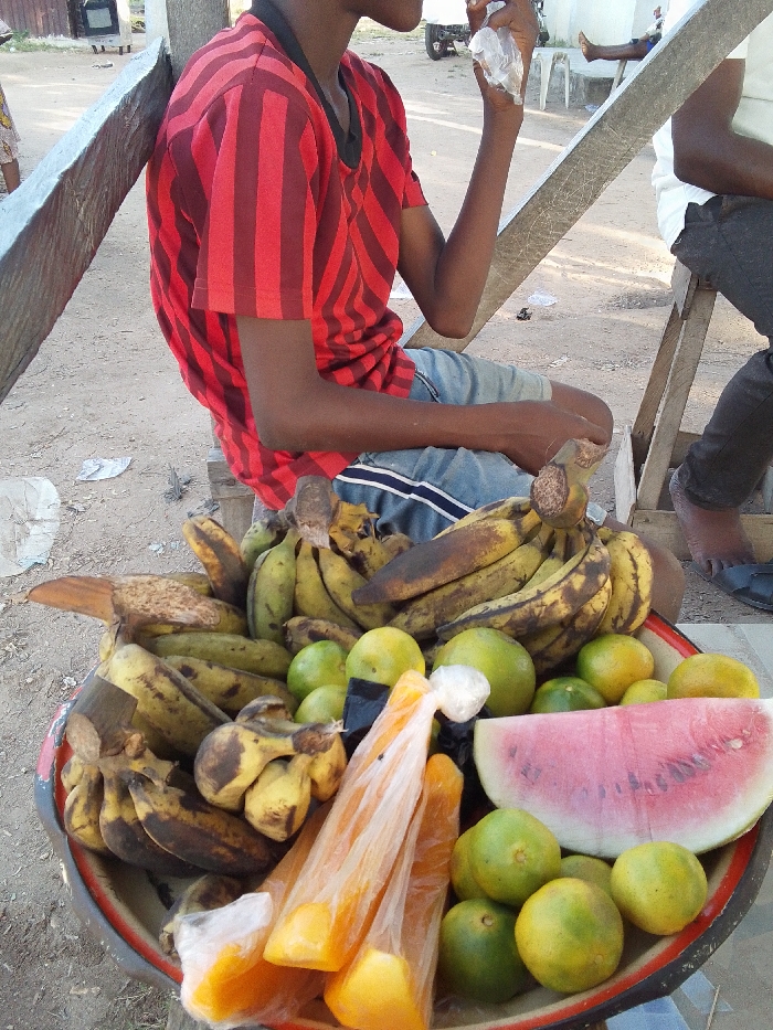An outdoor scene depicts a street vendor's setup, likely in Unknown, Unknown. In the foreground, a large circular metal tray with a red rim holds an assortment of fruits: numerous bunches of ripe bananas and plantains (some green, some yellow with brown spots), a quantity of small green and yellow citrus fruits, a thick slice of pink watermelon with visible seeds and rind, and several conical clear plastic bags containing a yellowish-orange substance. Behind the tray, a person with dark skin, wearing a red and black striped short-sleeved t-shirt and light blue denim shorts, is seated on a rough wooden bench. This individual holds a small, clear plastic bag with a light-colored item to their mouth, appearing to eat. To the right, the lower legs and feet of a second person, clad in dark trousers and black slide sandals, are visible, also seated on a wooden structure. The ground is unpaved dirt with scattered debris. In the distant background, a white building, white plastic chairs, and parts of a motorcycle are indistinctly visible.