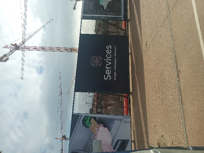 The image depicts a construction site in Casablanca, Morocco, viewed from a ground-level perspective. The foreground features a light-colored, gravel-textured surface bordered by a darker paved area on the right, separated by a low curb. A portion of a silver-colored vehicle is visible on the far left. A temporary construction hoarding spans the midground, consisting of various panels. The leftmost visible panel displays a photographic advertisement of a hand inserting a green tube into a grey machine. A prominent black panel centrally features a stylized flower emblem, the word "Services" in white text, and the subtext "Banque . Laboratoire . Pharmacie". Several reflective or metallic panels are interspersed along the hoarding. Behind the hoarding, a red pipe or conduit system is visible horizontally, with exposed earth and early-stage construction elements discernable. The background is characterized by an overcast sky with heavy grey clouds, above which at least three tall yellow and orange tower cranes are prominent, indicative of ongoing large-scale construction. No individuals are present in the observable scene.