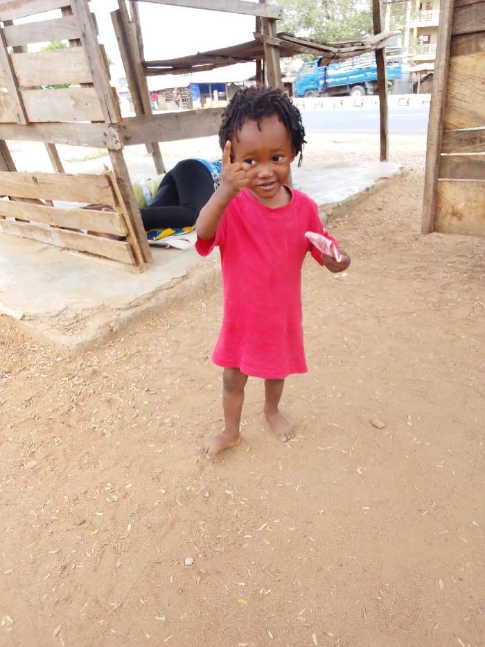 An outdoor scene in Adankolo, Nigeria, depicts a young child standing barefoot on light brown dirt in the foreground