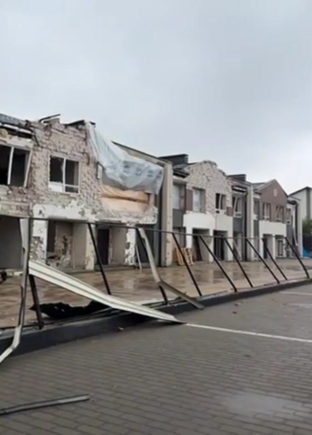 row of buildings severely damaged, likely by shelling or bombing, as evidenced by the collapsed roofs and walls. The buildings are two-story townhouses with brick and white facade elements. Debris is scattered in front of the buildings, and a damaged metal barrier lies on the ground. The scene is bleak and wet, suggesting recent rainfall. The cloudy sky adds to the somber atmosphere. The street is paved with bricks and has parking lines marked. There are small trees or bushes between some of the houses, but many are broken or overturned. The video pans along the row of houses, showing the extent of the devastation.