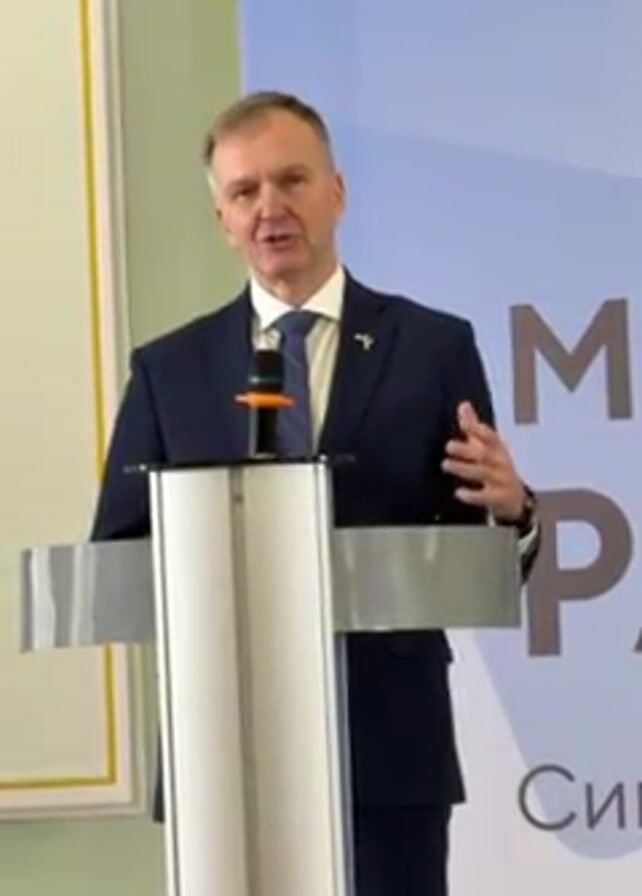In a medium shot, a man stands behind a podium speaking. He is wearing a dark blue suit, a light blue tie with a small pin, and a watch on his left wrist. He has short brown hair and appears to be in his late 50s or early 60s. He gestures with his hands as he speaks into a microphone attached to the podium. The podium is light-colored with silver accents. Behind him is a light blue backdrop with text in a different language. To the left, partially visible, is a framed piece of art on a light-colored wall. The setting seems to be indoors, possibly a conference or presentation room. The lighting appears even and artificial.