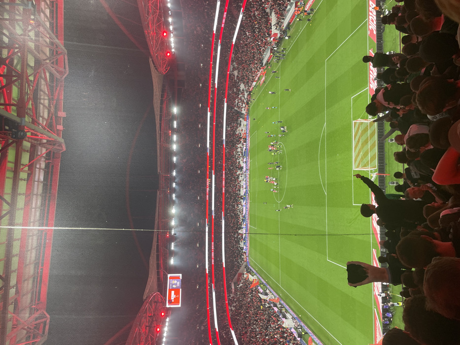 A high-angle view of a soccer stadium, likely during a game. The brightly lit green field is visible, with players scattered across it. The stands surrounding the field are packed with spectators. The stadium architecture includes red structures and lighting. A display screen is visible near the field. A fan is seen raising their hand, possibly celebrating. The photo captures the energy and excitement of a live sporting event.