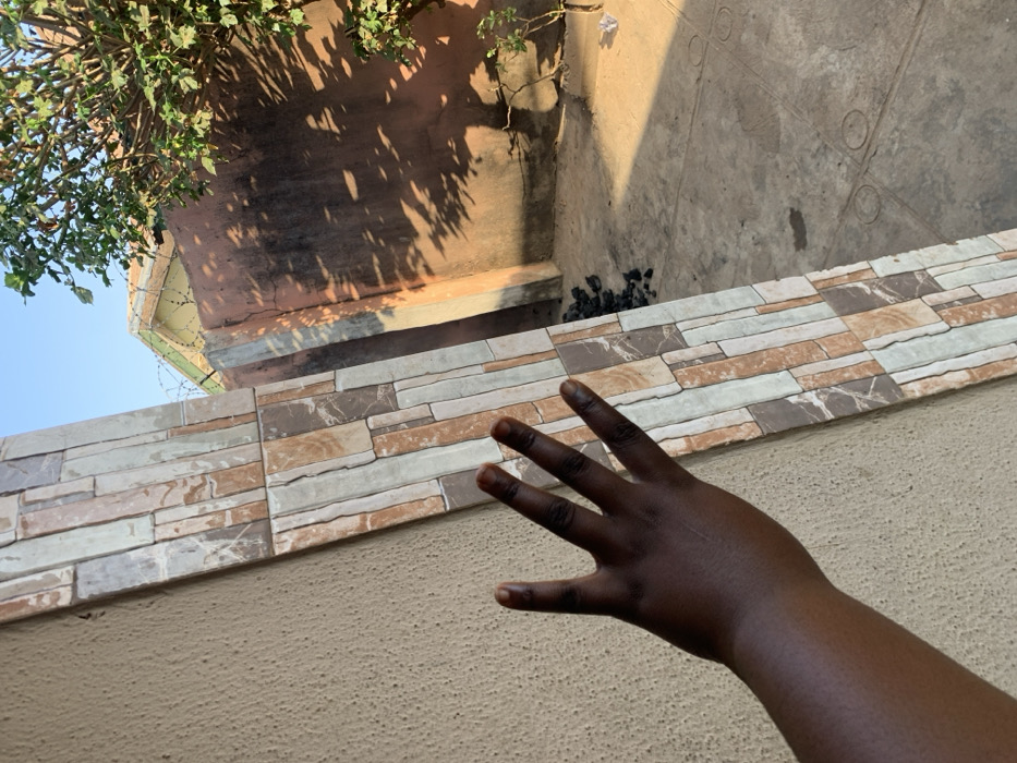 A low-angle shot features a person's dark-skinned hand with fingers spread, extending towards the upper-right. Behind the hand, a beige wall with a decorative tile border of brown and beige faux stone textures runs diagonally across the frame. Above the wall, a building's exterior shows a peach-toned wall with tree shadows, and a section of barbed wire. A concrete surface and dark objects, possibly foliage or debris, sit between the peach wall and tiled border. A tree with green leaves is visible in the upper-left corner.