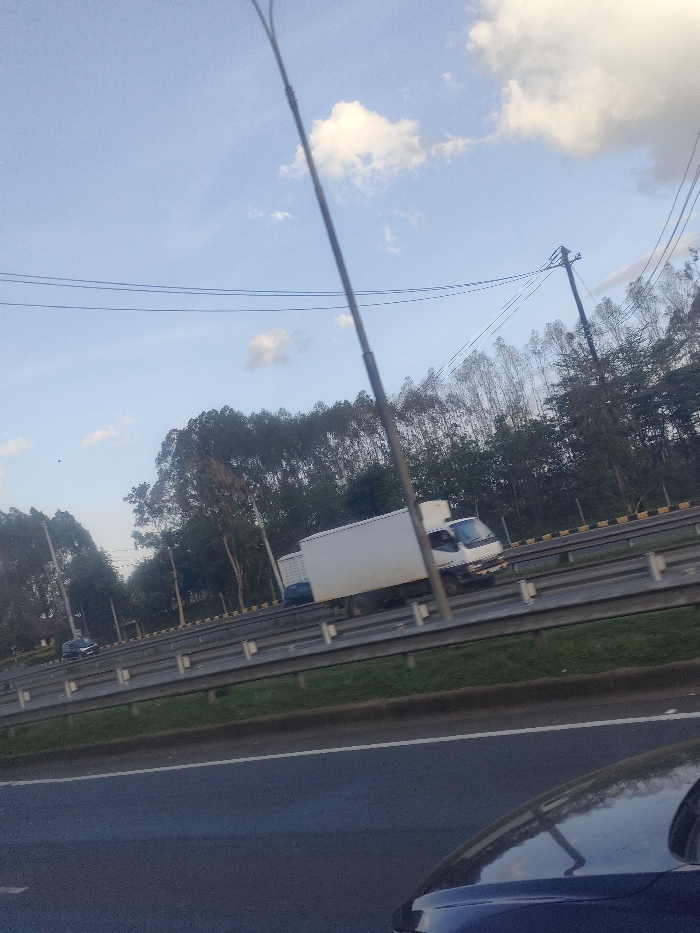The image displays a multi-lane highway scene under a blue sky with scattered white clouds, taken from a moving vehicle. A blurred grey streetlight pole bisects the upper left portion of the frame. On the far side of the highway, a white box truck with a dark cab travels leftward, followed by a dark blue passenger vehicle. Another dark vehicle is visible further left on an adjacent road or lane. The highway features silver metal guardrails separating lanes, with a concrete barrier marked with yellow and black stripes beyond. A dense line of trees forms the background, with a dark wooden utility pole carrying power lines visible on the right. The lower right foreground reveals a portion of a dark blue vehicle's hood. No individuals are visible. This infrastructure is characteristic of a major highway, such as one found in Juja Ward, Kenya.