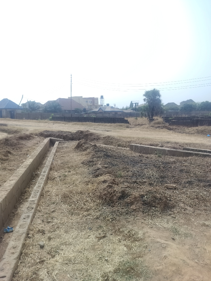The image depicts an open, undeveloped plot of land in Sabon Tasha, Nigeria, under a bright, clear sky