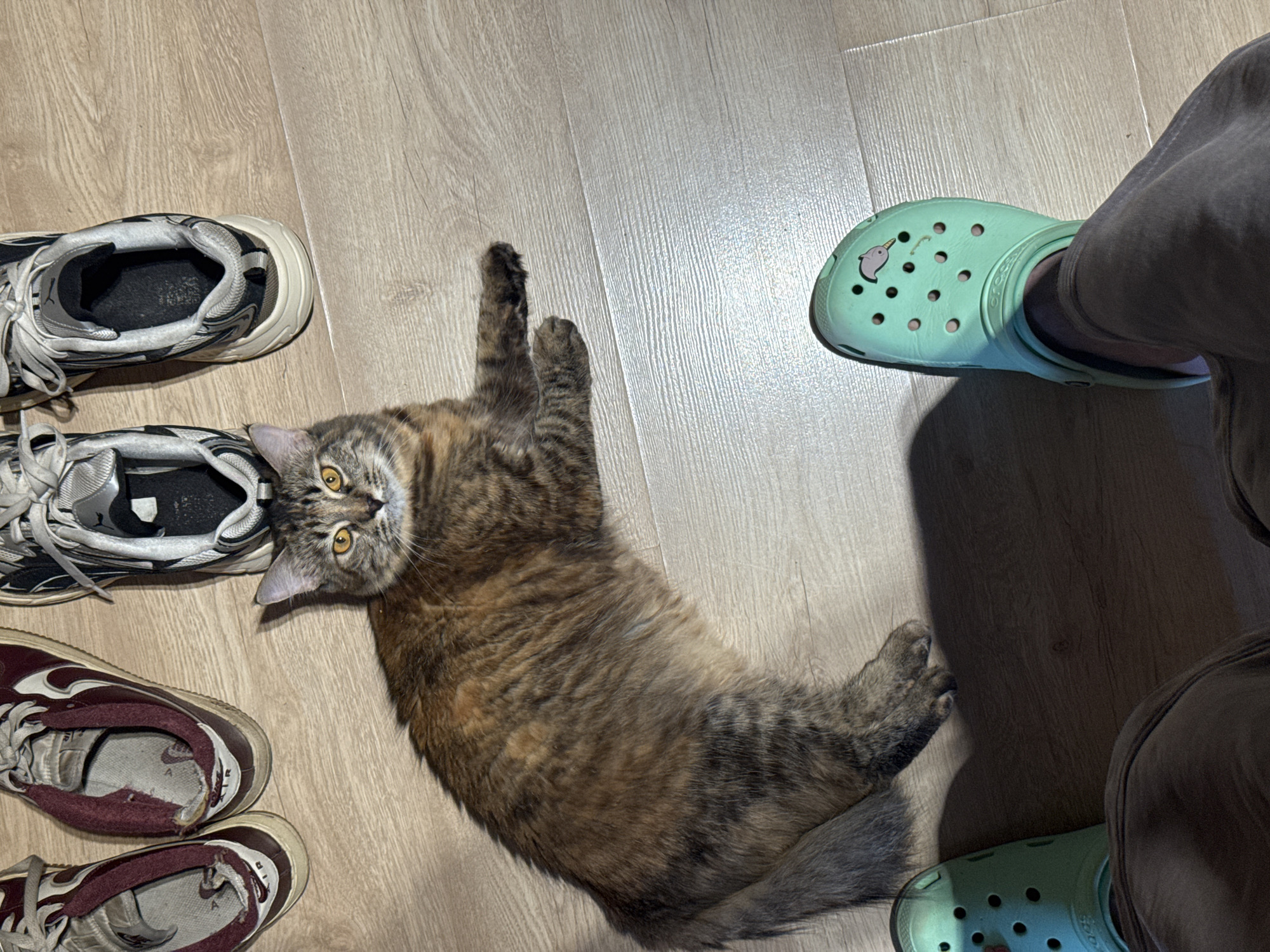 - "This indoor scene, located in Murino, Russia, features a domestic cat, various footwear, and a person's lower leg on a light-colored wooden floor" by FM-WjUDm2, licensed under CC BY 4.0