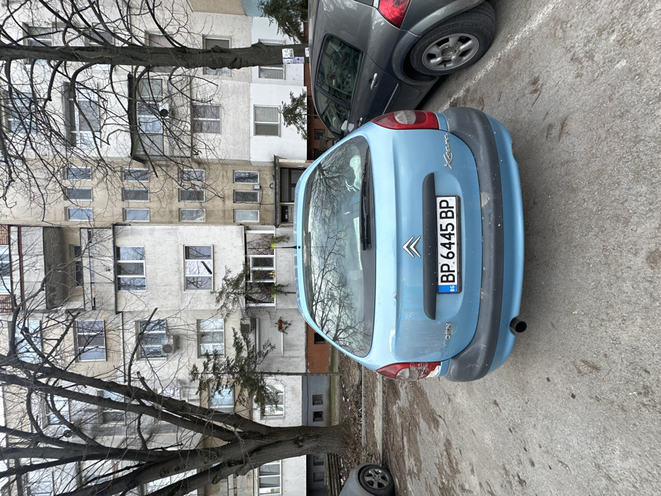 The scene depicts a street-level view in Kozloduy, Bulgaria, during daylight hours, likely in late autumn or winter. A light blue, four-door Citroën Xsara hatchback is parked, viewed from its rear. The vehicle's paintwork shows dirt accumulation, particularly on the tailgate and bumper. Its Bulgarian license plate is displayed as "BG BP 6445 BP". A black exhaust pipe protrudes from the lower left of the rear bumper. To the immediate right of the Citroën, a dark grey hatchback, partially visible, is parked. Only its front-left side, including a wheel and part of its body, is within the frame. On the far left of the image, a small section of another dark-colored vehicle's wheel and lower body is present. The vehicles are situated on a cracked, mottled grey concrete or asphalt surface, consistent with a parking area. In the background, a multi-story residential building, appearing as an apartment block, dominates the view. Its facade exhibits varying shades of light grey, white, and beige, with numerous windows of different designs and some enclosed balconies. External air conditioning units are mounted on the building's exterior. Several large, bare-branched deciduous trees, indicative of cooler weather, stand in front of the building, interspersed with smaller evergreen trees at ground level. The sky above is overcast and light grey, reflecting in the rear windows of the parked cars. No individuals are visible, and no active interactions are occurring within the frame.