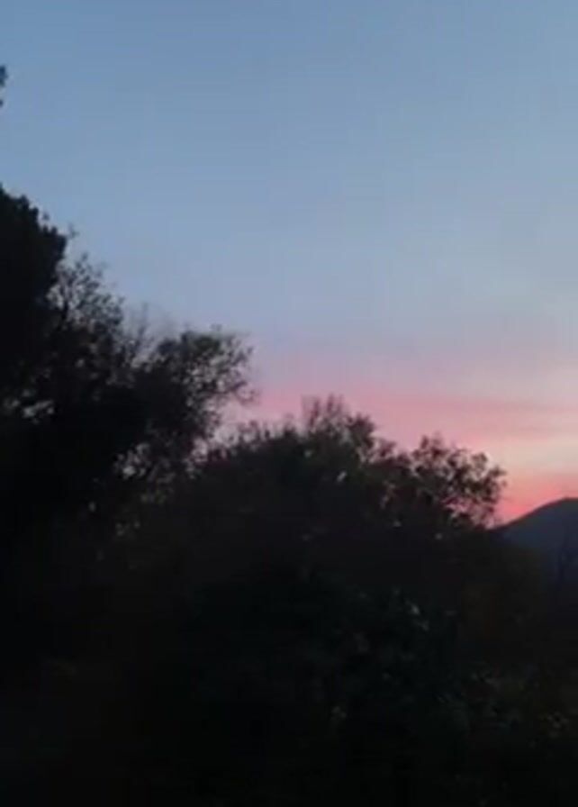 sky with shades of blue, pink, and red at sunset. The silhouette of trees and a hill are visible in the foreground. A few buildings can be seen near the bottom right corner.