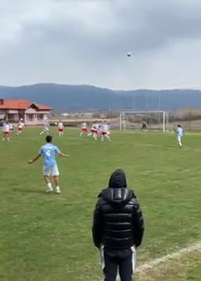 A soccer game is in progress. Players in blue and white are on the attack, while players in red and white defend. The ball is in the air, heading toward the goal, which is guarded by a goalkeeper. A few people are watching from the sidelines. The field is green and surrounded by a building with a pink roof, and mountains in the background. The sky is overcast.