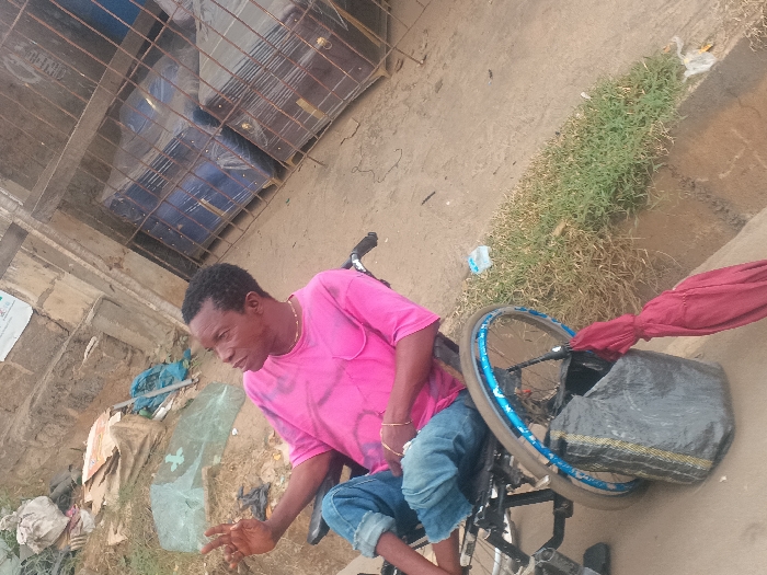 In Orifite, Nigeria, an adult male is observed seated in a manual wheelchair on an unpaved urban surface