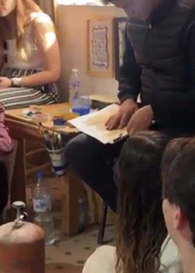 A group of people are gathered in a room to learn about art. A man is sitting on a wooden stool, demonstrating a technique on paper with the aid of a small brush and several small containers filled with liquids of varying hues. There is a bottle of water and some paintbrushes on the table. The people are watching the man intently. There is a window behind the man, and a framed image on the wall, and a large gas tank on the floor.