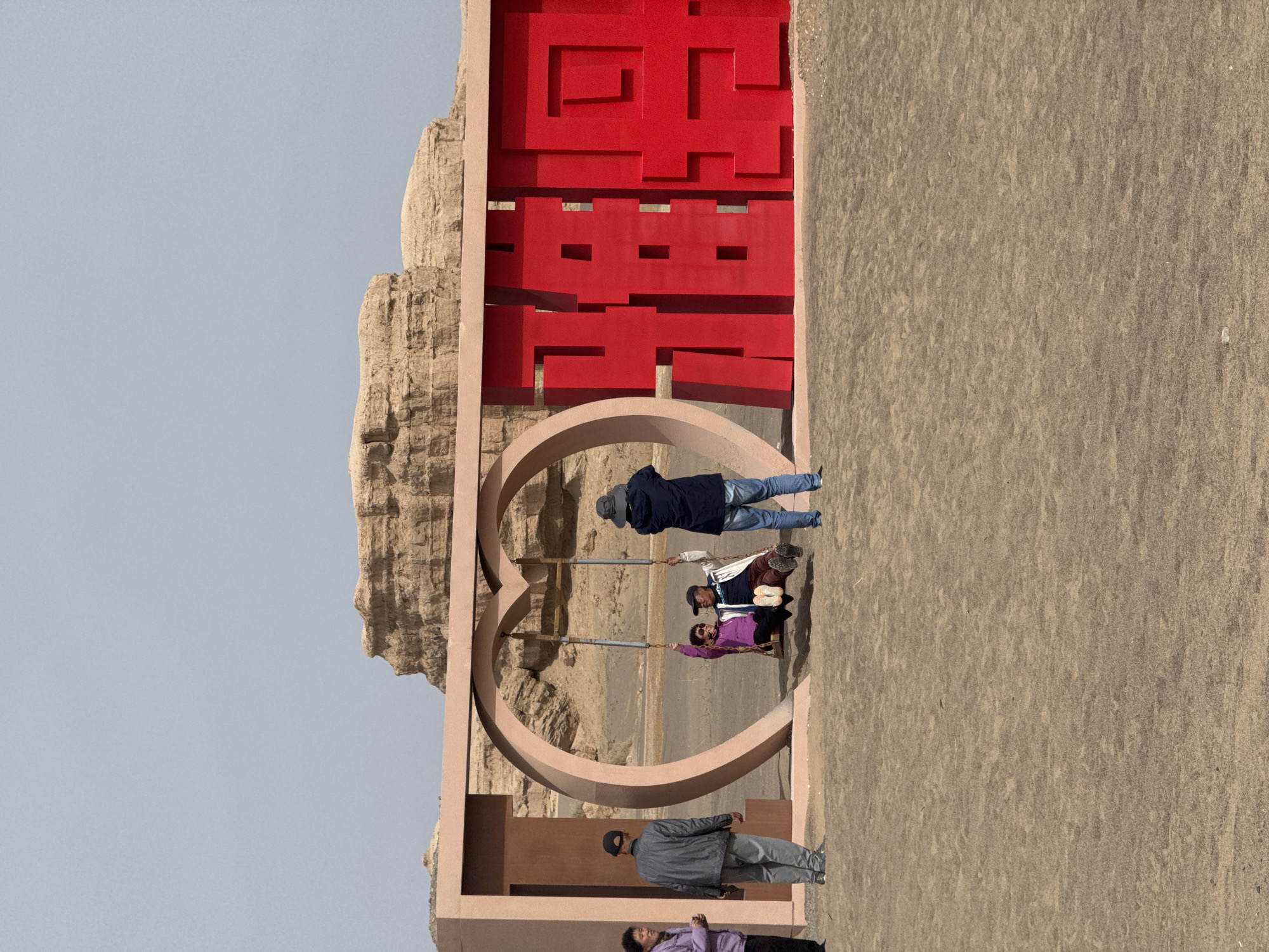 group of people at a scenic spot in Dunhuang City, China. They are posing within and around a large, framed structure composed of a red Chinese character above a heart-shaped archway. Two adults are on a swing suspended in the heart. One adult stands on top of the heart. One adult stands to the left in front of the heart, and one adult stands in front, to the left corner of the frame. A gray sky is visible behind a rock formation, which appears to be adjacent to the structure. The ground is a sandy color.