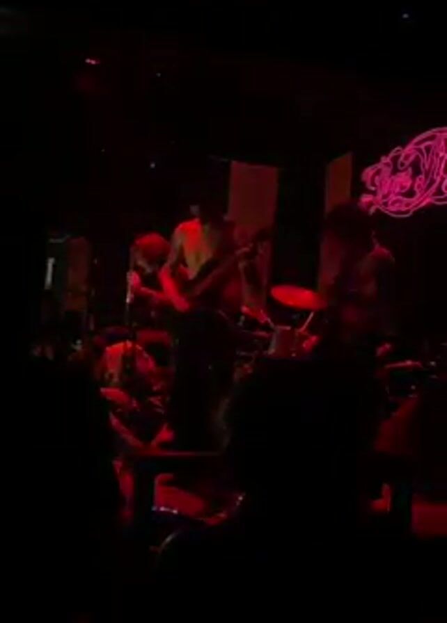 band performing live on a small stage in front of an audience. The scene is dimly lit with red lights, creating a somewhat obscured view of the band members. The band consists of a guitarist without a shirt playing on the left, a drummer in the back, and another guitarist on the right. The audience is visible in the foreground, partially obscuring the view of the stage. The room appears to be a music venue with a banner visible in the background. The band seems to be performing with energy.