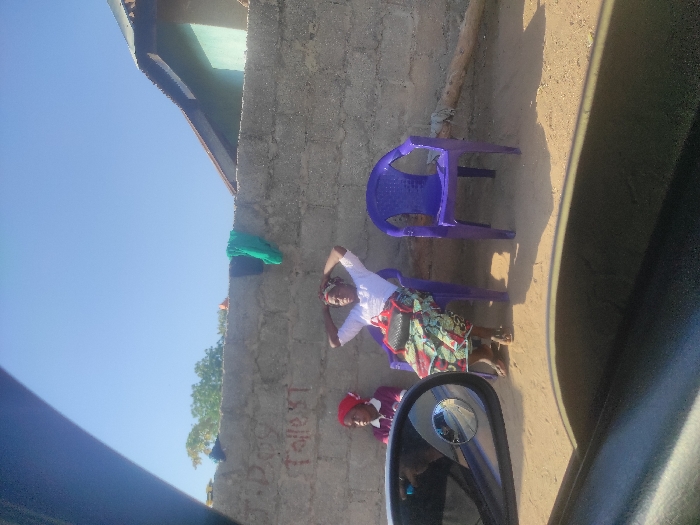A woman rests on a purple plastic chair against a cinder block wall outdoors on a sunny day. Another woman with a red headscarf sits near her. A green cloth hangs on the wall above them. A building roof is visible in the background. The scene is viewed from inside a car, with the side mirror visible. The wall appears to have writing on it. The ground is dusty.