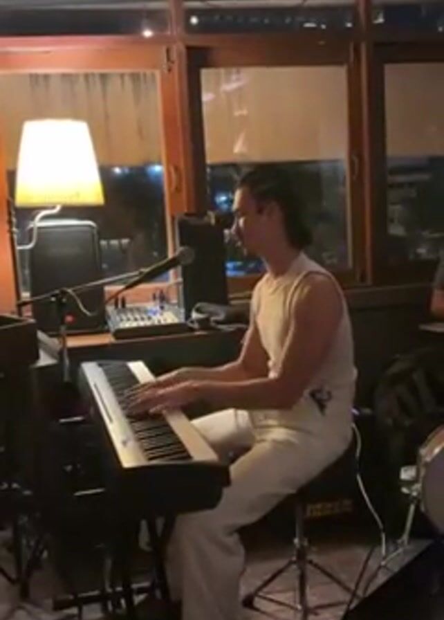 man playing a keyboard and singing into a microphone in what appears to be a music venue. The man is wearing a light-colored tank top and pants and is seated on a stool. The keyboard is on a stand in front of him, and a mixing board and speaker are to his left. Behind him is a window with a view of the city. To his right, partially visible, is a drum set. The room has a rustic, somewhat unfinished look with exposed ductwork and a lamp illuminating the space. He is fully engaged in his performance.