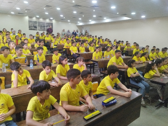 The image displays an indoor scene within a tiered lecture hall or large classroom located in the city of Al-Khalil, Palestinian Territory. Approximately 100 to 120 children, predominantly between 7 and 14 years of age, are seated in rows of dark wooden desks and benches. Nearly all children are uniformly dressed in bright yellow t-shirts. They are observed in attentive postures, mostly facing forward, with some individuals looking towards the sides. Items visible on the desks include pencils, paper, blue abacus tools, and several water bottles. In the background, at least ten adults are present, either standing or seated at the rear of the hall. The room features light-colored walls, an acoustic tile ceiling equipped with numerous recessed lights and some linear fluorescent fixtures, and two framed black-and-white images depicting historical or architectural scenes mounted on a wall section at the back. The environment is brightly and evenly illuminated.