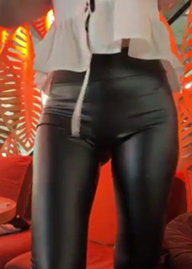 A woman stands and turns in front of a sofa. She has dark hair and wears a white top and black, shiny leggings. She makes a full rotation. The room is lit with reddish-orange light and has decorative panels on the wall. A person is seated on the sofa in the background.