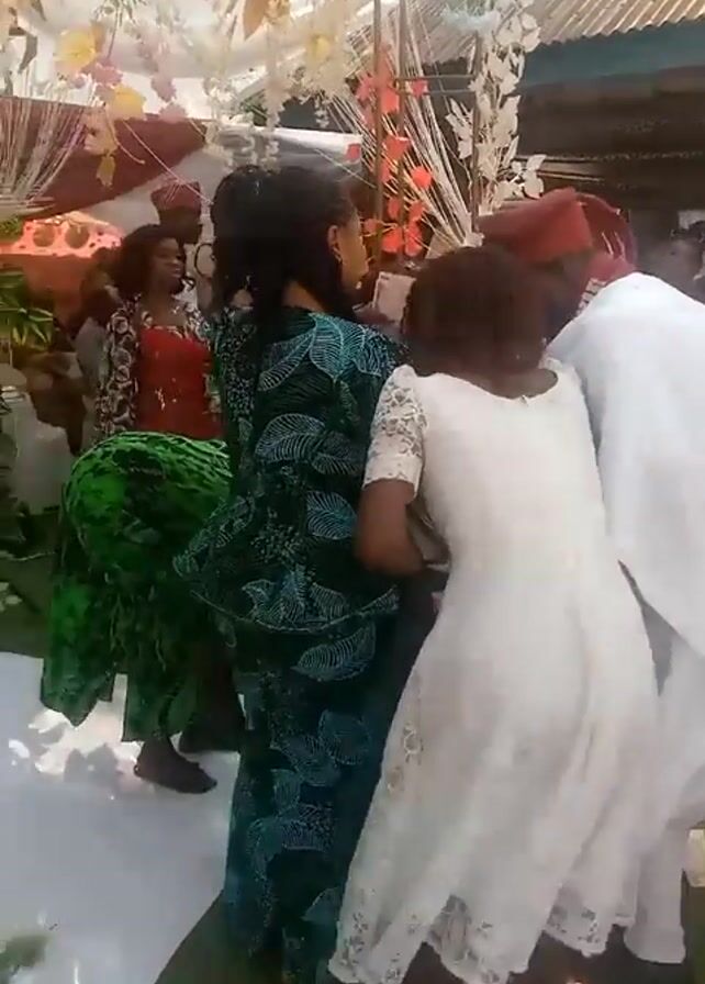group of people dancing, likely at a wedding or celebration. Most are adults, including men in traditional white robes and red caps. There are women in patterned dresses, a woman in a white dress, and a woman in a black shirt with an orange and brown patterned skirt and headwrap. Money is scattered on the green carpet. The location appears to be outdoors under some kind of decorated canopy, with houses in the background. People are interacting and moving to music.