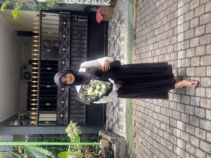 A woman in a hijab poses in front of a house with a bouquet of white flowers. She wears a white blouse under a black dress and has a small black bag on her shoulder. She stands on a brick path beside a garden. The house behind her features a black metal gate with gold detailing. The lighting is bright, suggesting an outdoor, daytime setting.