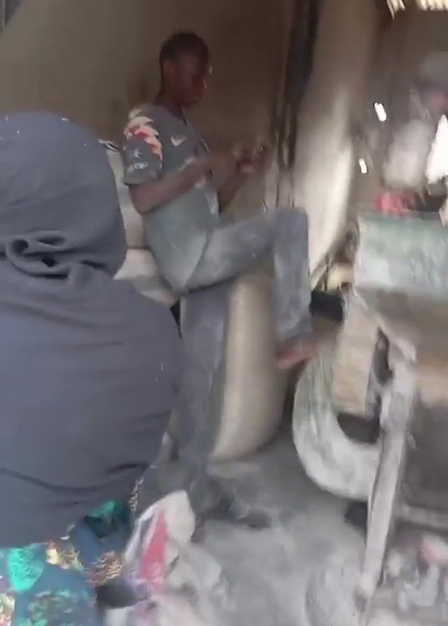 In a dimly lit room, a young man is sitting on a large sack, focused on his mobile phone. He is wearing a dark t-shirt and jeans, both covered in dust, and he is barefoot. A woman in a black hijab and a colorful patterned skirt stands in the foreground. To the right, there is an old grinding machine covered in dust and debris. The room appears to be a workshop or storage area, with sacks stacked against the walls and minimal lighting. The focus of the video is on the man and his phone.