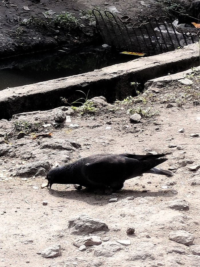 The scene in Alaiyabiagba, Nigeria, depicts a dark-feathered pigeon foraging on dry, light brown earth. The pigeon, a single subject, is positioned in the lower mid-ground, with its head bent down, actively pecking at a small, light-colored object, likely a food crumb. The ground around it is uneven, composed of soil and scattered small stones and pebbles. In the mid-ground and background, a concrete curb-like structure separates the dry ground from a dark, narrow body of water, indicative of a drainage ditch or canal. The water appears stagnant, with reflections and some vegetation along its muddy banks. Above the water, on the far bank, a large, dark, grid-patterned metal object, resembling a discarded shopping cart or grate, is visible. Various pieces of litter, including plastic and a yellow rectangular item, are scattered near the water and the metal object. Sparse green vegetation grows along the edges of the concrete structure and the water channel. The lighting suggests an outdoor daytime setting.