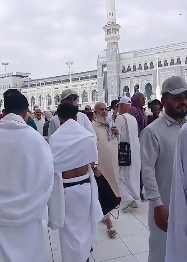 The video depicts a group of individuals walking in what appears to be a public square or courtyard. The majority of them are dressed in white robes, suggesting they are participating in a religious pilgrimage. There is a tall tower in the background, indicative of a mosque or religious structure. Some people are wearing casual clothes as well. One man wearing a white robe is wearing a blue shoulder bag. Some of the individuals turn toward each other to have a quick conversation.