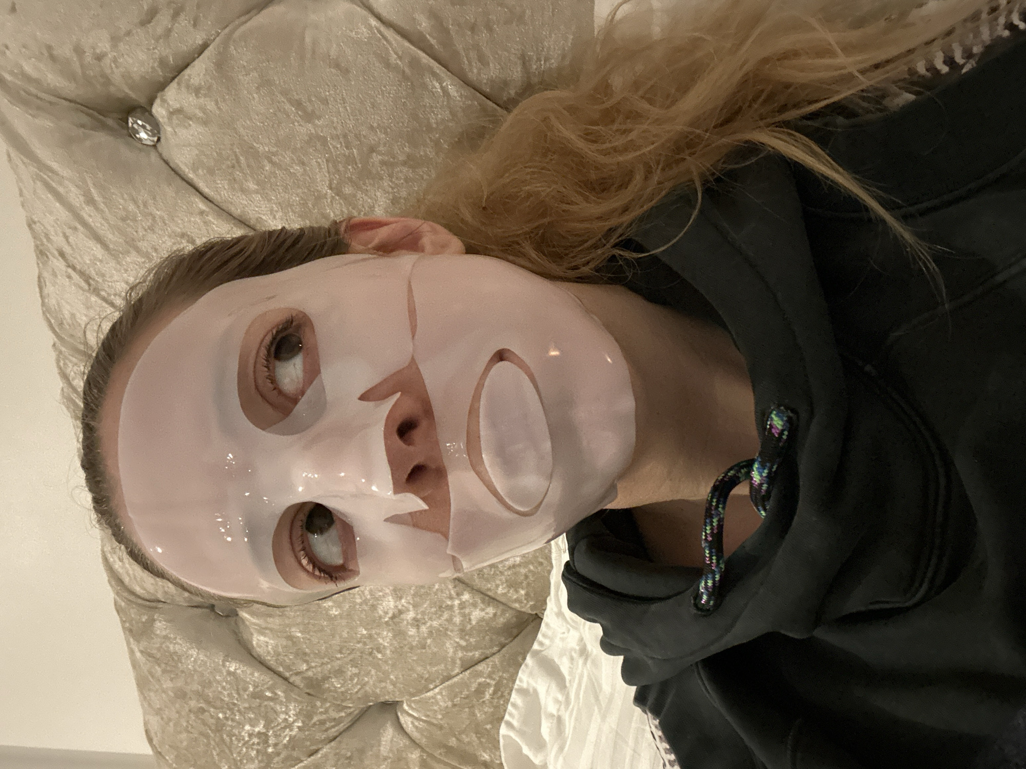 A woman is lying on a bed with a white sheet and a velvet headboard. She is wearing a white facial mask and a black hoodie. The drawstrings of the hoodie are visible and are black with multicolored strands woven in. Her hair is blonde and partially visible. The photo's setting is not identifiable as London, United Kingdom, or any other specific location.