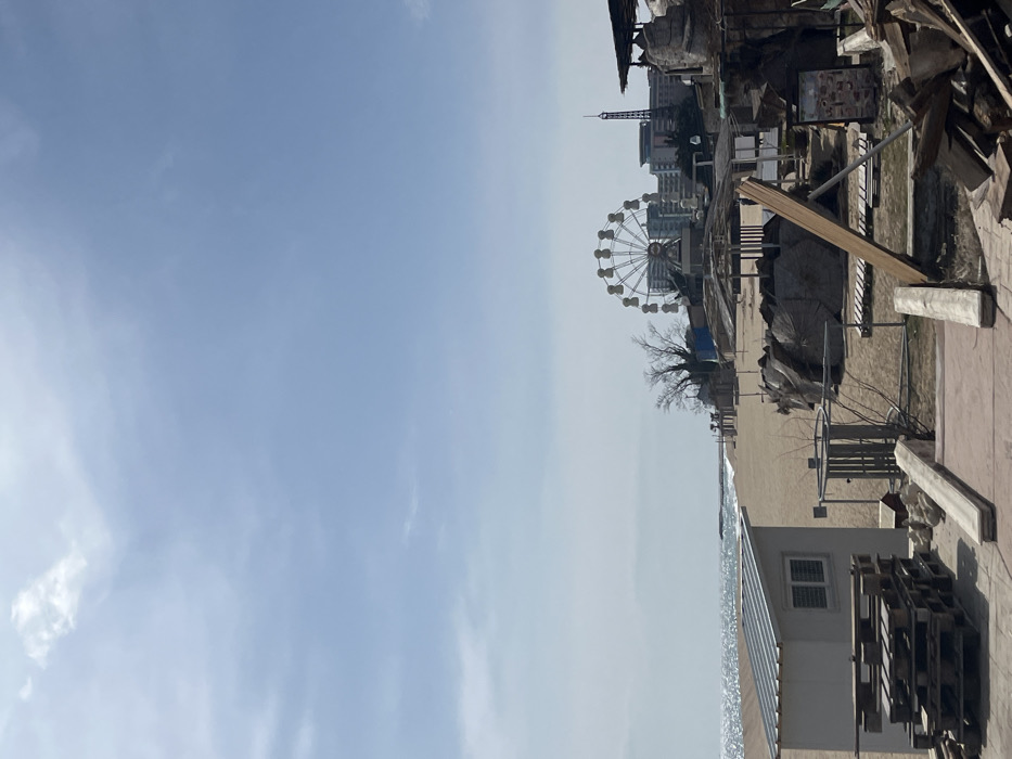 The image depicts a coastal scene in Varna, Bulgaria, specifically a section of its urban beach area. The environment is under a clear, light blue sky with sparse, wispy clouds, and the sun reflects off the calm sea. In the foreground, on the left, a white, single-story building with a corrugated metal roof and a horizontal-grated window stands. Adjacent to it are multiple stacks of wooden pallets. Centrally, a reddish-brown paved area, flanked by two parallel wooden planks, extends towards the beach. To the right, a disorganized pile of various wooden debris, including planks and blocks, is visible, alongside a large wooden board propped vertically with a support. Further right, a dark, artificial rock-like structure with an overhead canopy and an attached menu board is partially visible. The midground features a wide, sandy beach. The Black Sea extends to the horizon on the left, with sunlit waves breaking near the shore and a stone jetty or breakwater visible in the distance. Scattered across the beach are several rudimentary, open-sided structures, likely beach kiosks or shelters, some covered with dark tarps. A leafless deciduous tree is situated behind some of these structures. A single, indistinct individual is observed walking on the sand in the mid-right portion of the beach. The background reveals an amusement park area and urban development. A large Ferris wheel with white gondolas and a red central hub is prominently positioned on higher ground behind the beach. Several multi-story buildings are visible behind and around the Ferris wheel. To the right of the Ferris wheel, a tall, slender structure resembling a miniature Eiffel Tower is identifiable. No discernible actions or interactions beyond the solitary pedestrian are present.