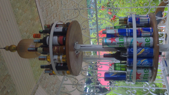 This image depicts an outdoor beverage display located in Kondeni, Tanzania. The central subject is a three-tiered circular stand with white metal supports and wooden shelves. The top shelf holds numerous liquor and wine bottles, including brands like "Gold" and "Zoroy," distinguishable by their labels and varying bottle shapes and colors. The bottom shelf displays an array of stacked aluminum cans, including Heineken Silver, Flying Fish, and Red Bull, alongside several glass bottles. The stand is centered beneath a golden, ribbed decorative finial or light fixture suspended from a light-colored, patterned ceiling composed of rectangular segments. A white, ornate metal railing with scrollwork patterns forms the immediate background, indicating the perimeter of an outdoor structure such as a gazebo or patio. Beyond the railing, dense green foliage and trees are visible, with red-roofed buildings partially discernible through the vegetation in the mid-ground. The scene is well-lit, suggesting daytime conditions. No individuals are present.