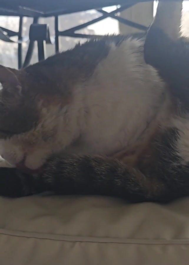 - "A cat is sitting on a white cushion under a table and grooming its paw" by FM-L3FhD2, licensed under CC BY 4.0