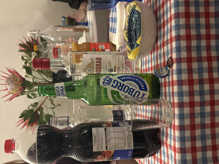 An indoor scene in Milan, Italy, depicts a casual gathering focused on a table covered with a red and blue checkered tablecloth. In the foreground, a 1.5-liter plastic bottle of dark carbonated beverage with Italian labeling is positioned next to an empty clear glass tumbler and a green glass bottle of Tuborg "Fresca Spina" beer. A blue Tuborg-branded bottle opener lies on the tablecloth. To the right, a white ceramic bowl contains a blue patterned insert and is surrounded by numerous lemon wedges. A stack of white paper napkins with blue checkered borders rests adjacent to the bowl. In the midground, several bottles are arranged: a clear glass bottle of "Vynograd Classic Distilled Vodka," two additional clear spirit bottles (one with a silver cap, another with a red cap), and a small bottle containing an orange liquid. The background features a light-colored wall with a floral arrangement in a dark vase, displaying large pink protea flowers, smaller white blooms, and green foliage. A person's hand holding a blue stemmed glass with a dark beverage is partially visible on the right side of the frame, indicating the presence of at least one other individual in the immediate vicinity. No specific actions or interactions between people are explicitly depicted beyond their presence.