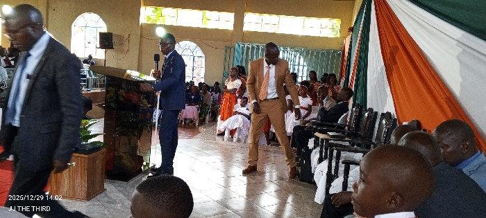 An indoor event is captured within an unidentified building in Unknown, Unknown. The scene features multiple individuals, predominantly adults and children of African descent. In the mid-ground, a man in a dark blue suit and glasses stands behind a dark, reflective podium, holding a microphone. To his immediate left, another man in a dark suit walks towards the left foreground. To the right of the podium, a man in a light brown suit with a patterned tie stands with his legs slightly apart, looking downwards. Behind these individuals, an audience is visible, some seated in dark chairs, and others standing. Several children, some dressed in white, are present among the attendees. The background includes light-colored walls with arched windows on the left and vertical drapes of white, orange, and green fabric on the right. The timestamp "2025/12/29 14:02 JJ THE THIRD" is digitally embedded in the lower-left corner.